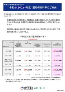 2026年3月27日 / 最終更新日 : 2026年3月27日 tatsugo_s 令和8年(2026)度 雇用保険料率のご案内 令和8年4月1日から令和9年3月31日までの雇用保険料率が改定されました。 給与計算や社会保険手続き等の際には、令和8年4月以降から新しい料率の適用となりますのでご注意ください。